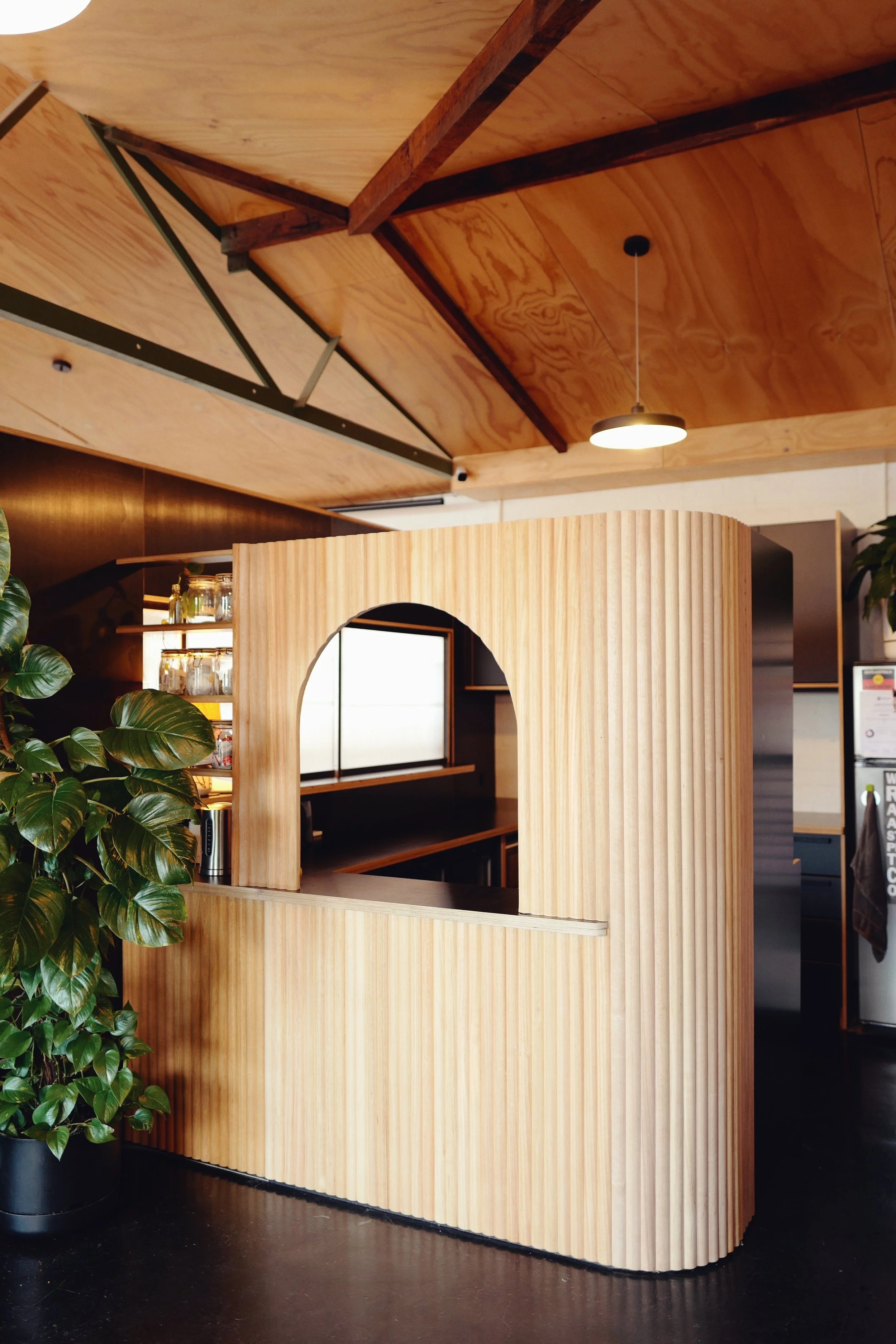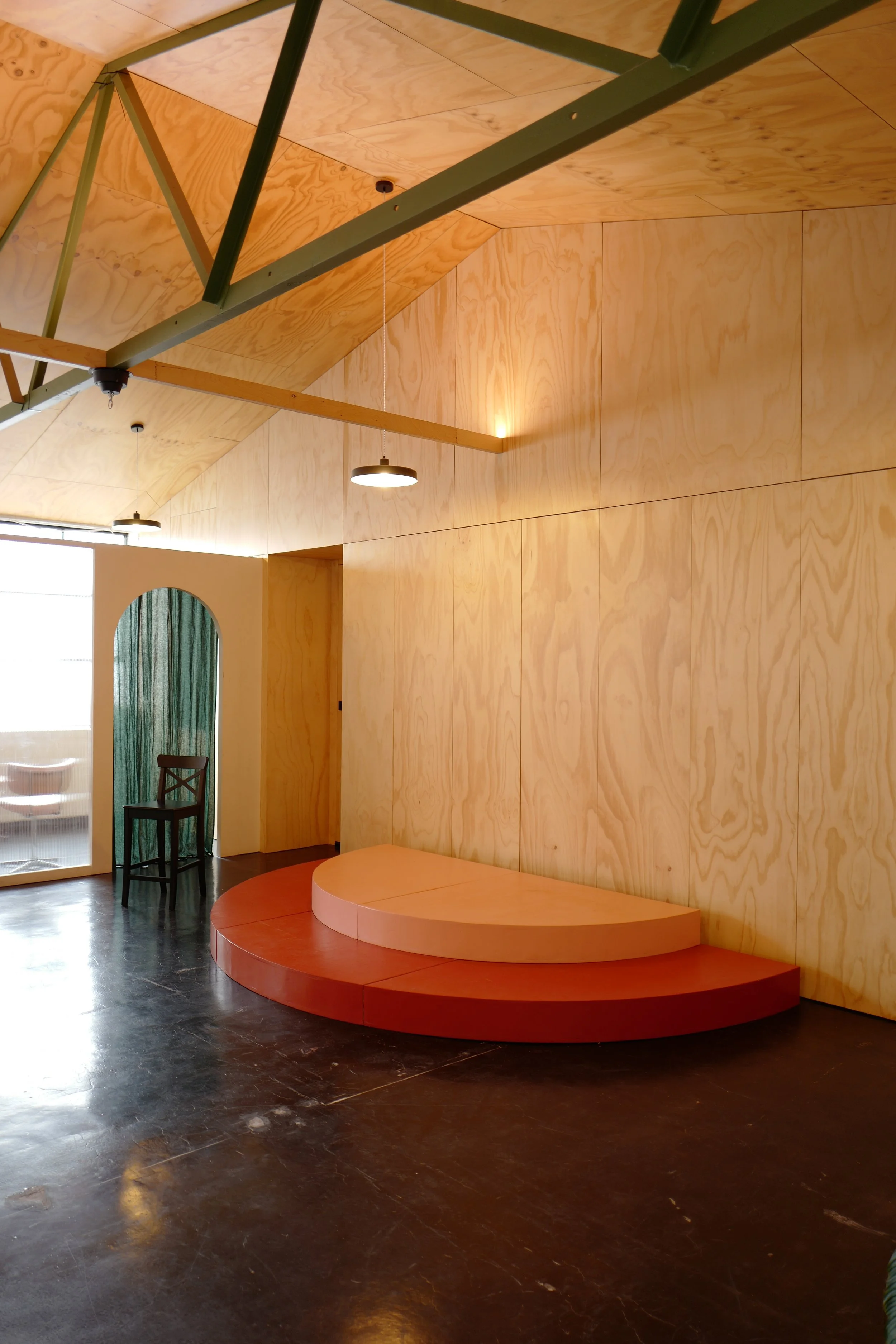 Lofty timber ceilings, chapel acoustics, exposed beams, natural light, gloss black concrete floors, private green room, bar, lounge area, heating/cooling. Option for two tier semi-circle stage, ping pong table, trestle tables, chairs, floor cushions, yoga mats. Ideal for performances, parties, wedding ceremonies, wedding receptions, group workshops, seminars, choirs, launches, live music, photoshoots, functions. Maximum capacity of 100 people. Located on upper level via external staircase. Not wheelchair accessible.